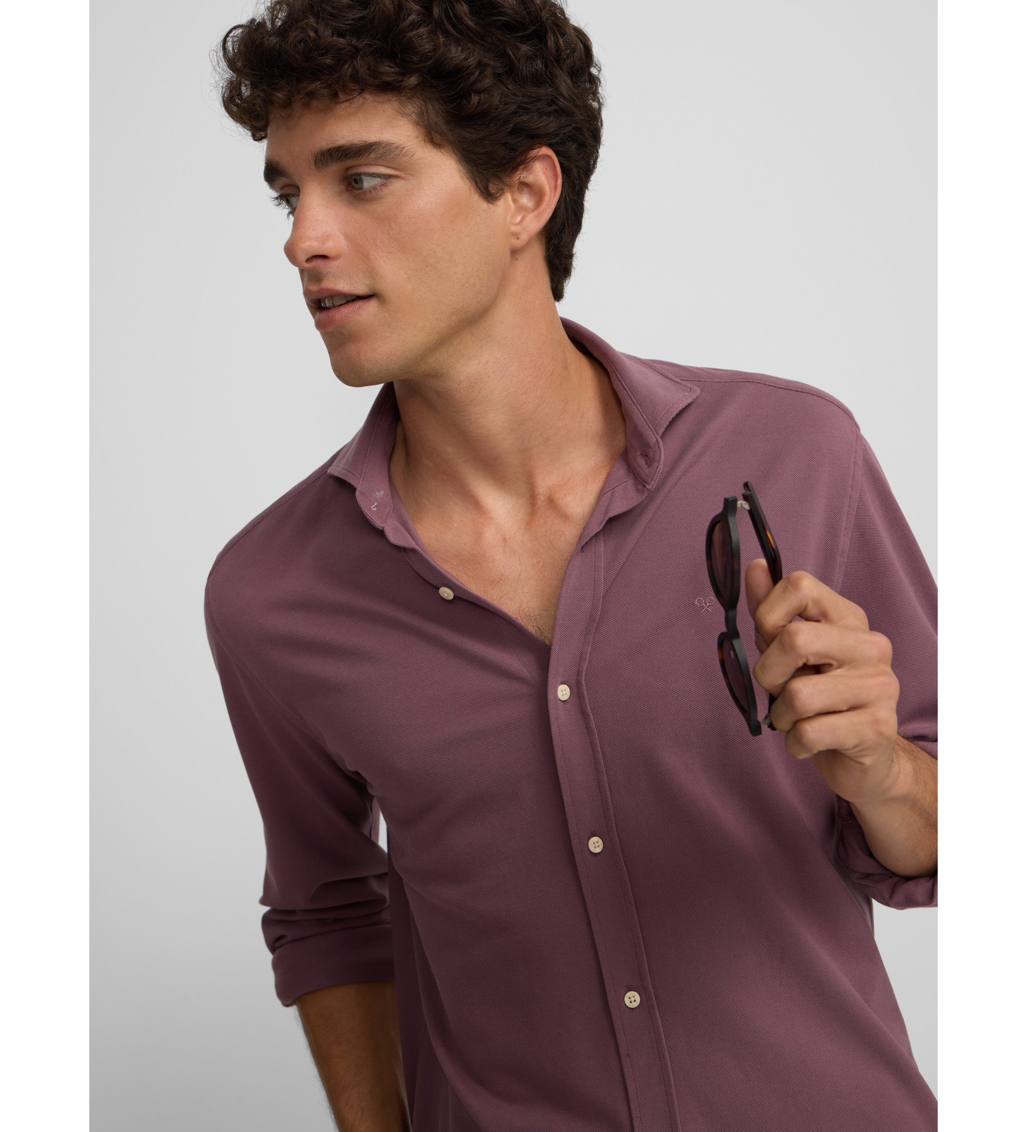 Enobarvna športna srajca bordo barve z udobno tkanino micropique iz 100-odstotnega bombaža in običajnega kroja. Ima izrezan ovratnik in dolge rokave z manšetami na gumbe. Na trupu ima izvezene rakete v tonu.