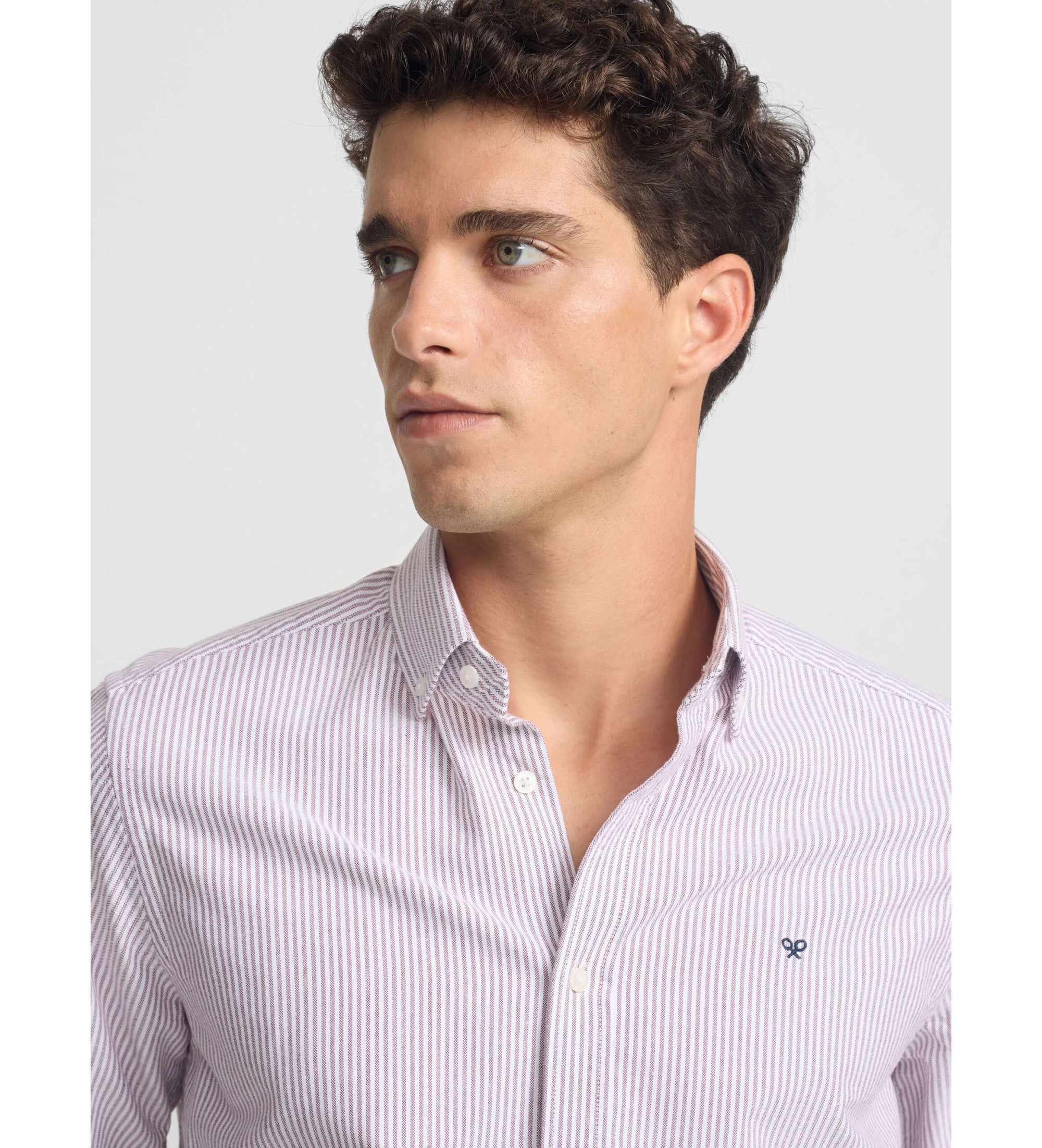 Športna črtasta srajca oxford iz 100-odstotnega bombaža. Ima ovratnik z gumbom navzdol, zapenjanje na gumb po meri in dolge rokave z manšetami na gumb. Na trupu ima izvezene rakete.