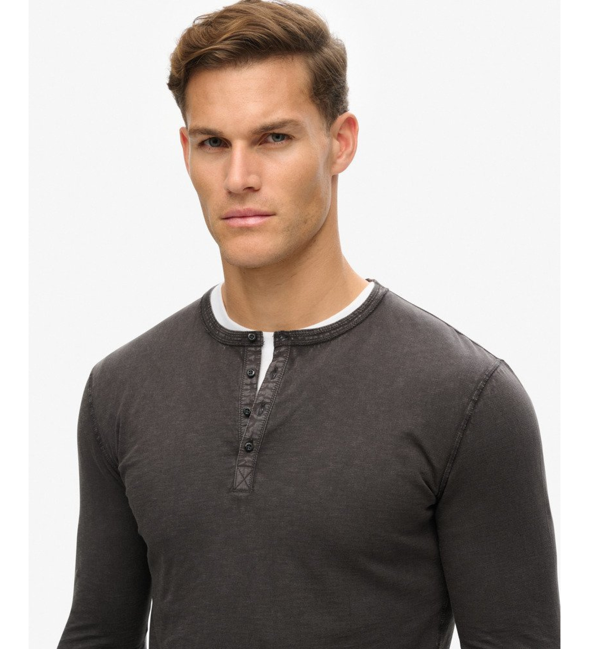 Antracitno siva majica henley z dolgimi rokavi, spranim zaključkom in kontrastnim belim ovratnikom. Značilna majica, ki združuje udobje tankega kroja s premišljenimi detajli za prefinjen vsakdanji videz.