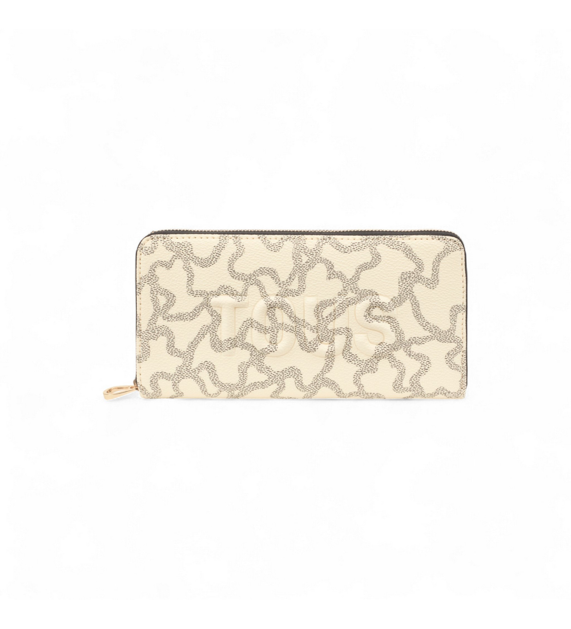 Denarnica TOUS Kaos Icon v bež in sivi barvi platna s potiskom Kaos s poliuretanskimi detajli. Zapiranje na zadrgo. V notranjosti so žep za kovance z zadrgo, osem rež za kartice in štirje odprti predali za bankovce. Mere (v x š x g): 10,5 x 19,5 x 2,8 cm.