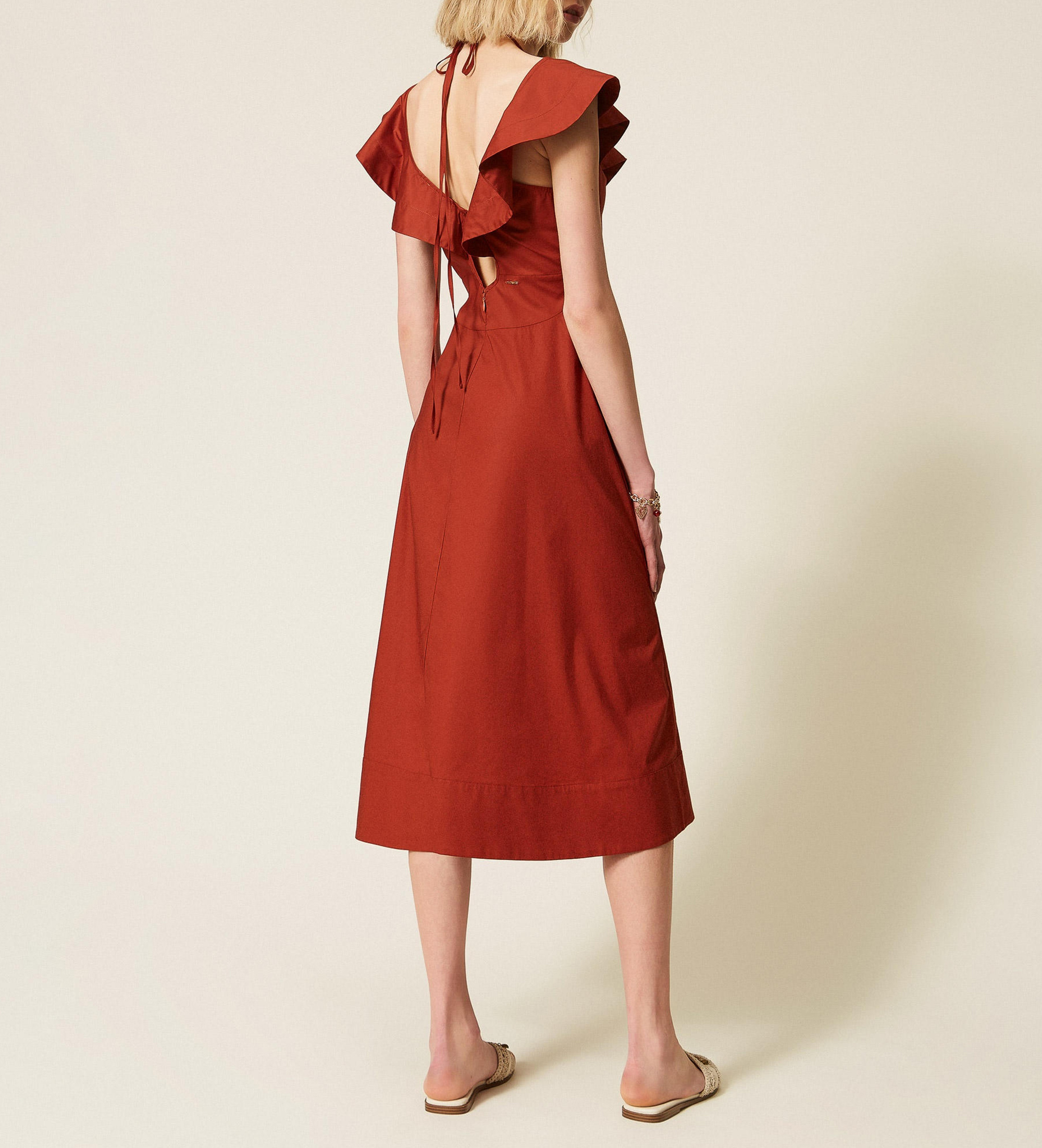 Midi obleka iz raztegljivega bombažnega poplina v rjavi barvi henne z volančki spredaj in zadaj. Oblika, ki združuje prilegajočo se, razširjeno silhueto z romantičnimi, ženstvenimi detajli za prefinjen videz, poln gibanja.
