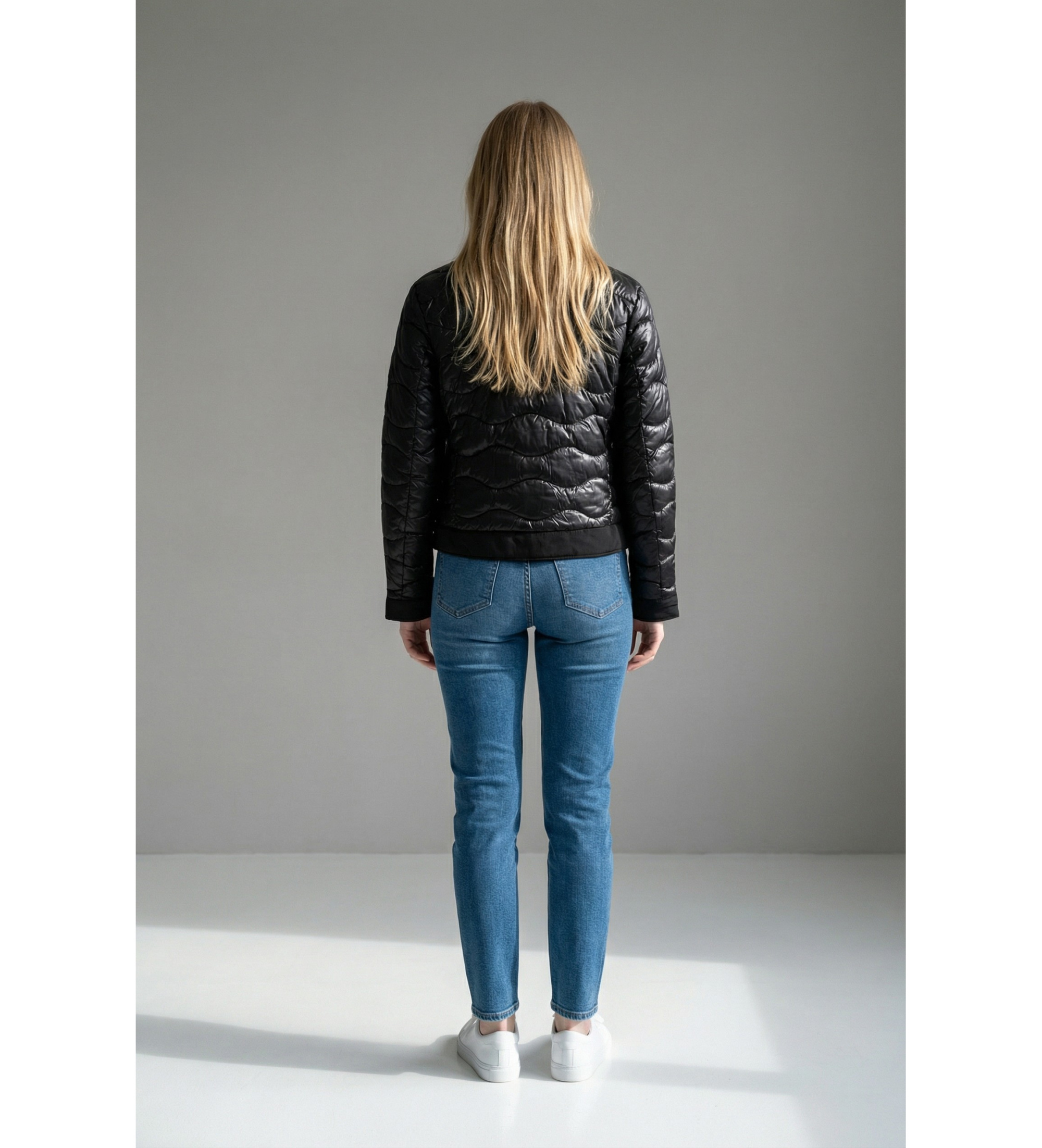 Blauer kort quiltad jacka i svart för dam, ett lätt och sofistikerat plagg som kombinerar vågig quiltning med en ren design utan huva för ett snyggt, urbant resultat. Den korta skärningen och de svarta stickade detaljerna gör den till ett feminint och mångsidigt plagg som passar perfekt för mellansäsongerna.