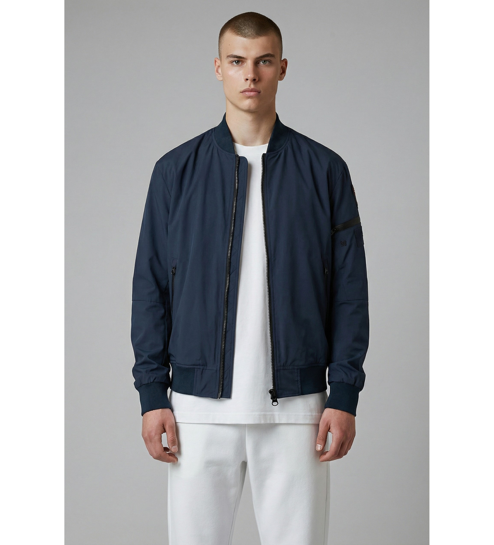 Upptäck denna regntåliga bomberjacka med taslan-detaljer och tejpade invändiga sömmar, en teknisk design som innehåller en innovativ mobiltelefonficka på vänster ärm för handsfree-belysning på natten. Detta plagg kombinerar avancerad funktionalitet med modern urban styling, perfekt för regniga dagar eller för dem som söker tekniska funktioner i sina fritidskläder. Kvalitetsfinish och praktiska detaljer gör plagget till ett mångsidigt vardagsplagg.