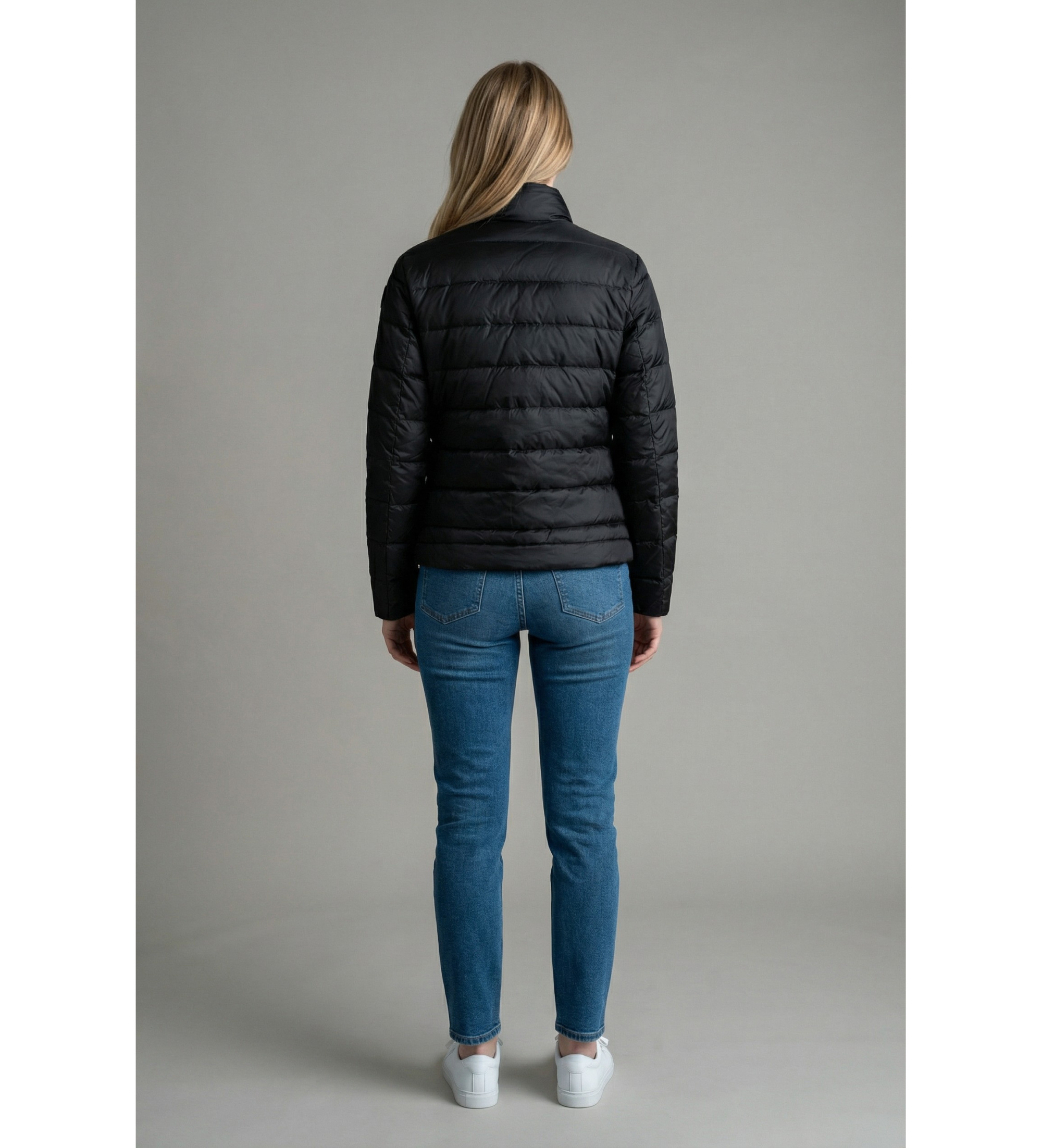 Upptäck denna quiltade jacka med koreansk krage och horisontella sömmar, en design som kombinerar modern elegans med värmande funktionalitet. Lättviktsquiltning i mjukt 55g 90/10-dun och en utsvängd passform skapar en smickrande silhuett som framhäver figuren utan att lägga till onödig volym. En justerbar dragsko i nederkanten och flera fickor gör den till ett mångsidigt och praktiskt plagg för mellansäsonger och stadsvintrar.