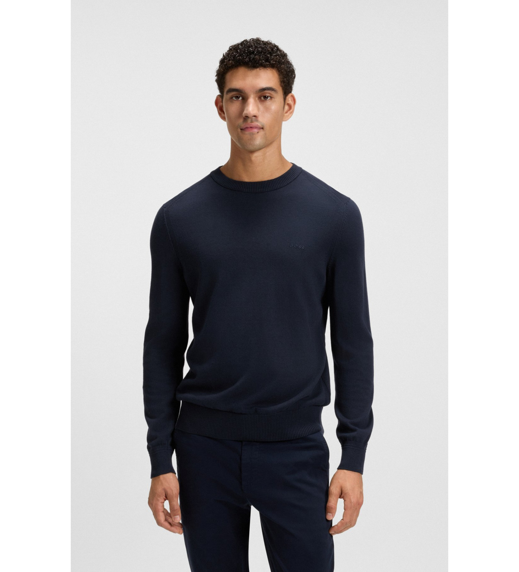 Uppdatera dina stickade plagg med denna BOSS Menswear-jumper i mjuk bomull med broderad logotyp och axeldetaljer. Bekväm regular-fit design.