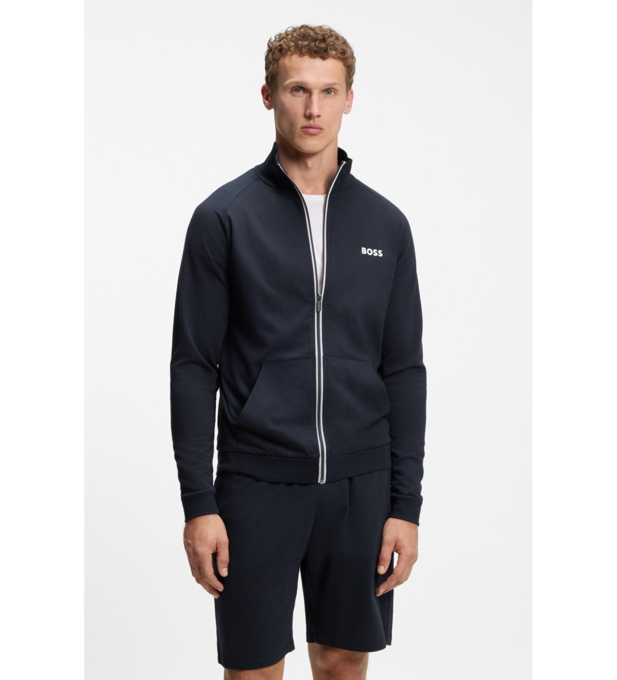 Hugo Boss sweatshirt med full dragkedja i marinblått med hög hals och logotyp på bröstet. Ett sportigt och sofistikerat plagg med en premiumfinish som kombinerar funktionalitet och urban stil i en ren och mångsidig design.