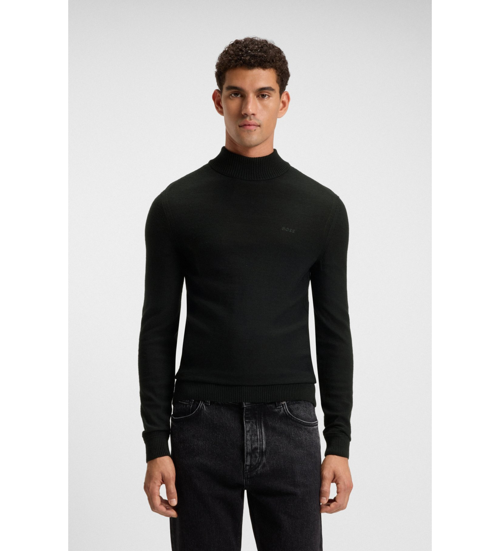 En rak jumper med hög krage och broderat BOSS Menswear-märke. Denna produkt innehåller minst 60% råmaterial av premiumkvalitet. Den är tillverkad av ull från ansvarsfulla källor. För oss innebär ansvarsfulla inköp ingen mulesing och efterlevnad av Five Freedoms-standarderna för djurskydd.