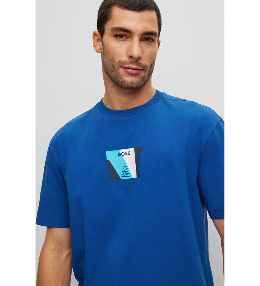 En BOSS Menswear T-shirt med dynamisk stil. Den här kortärmade T-shirten har en avslappnad passform i en jerseyblandning med stretch för komfort och har märkesdetaljer baktill och mitt på bröstet för en ny säsongslook.