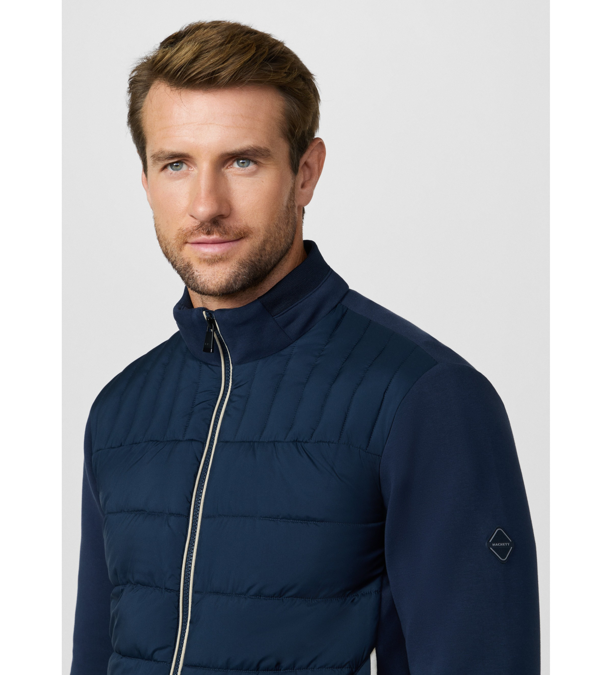 Hybridjacka i marinblått, ett tekniskt och sofistikerat plagg som kombinerar lättviktig quiltad kropp med stickade ärmar för ett urbant och funktionellt resultat. Perfekt för mellansäsongerna när du behöver värme utan att behöva en traditionell dunjacka, med en snygg men sportig finish.