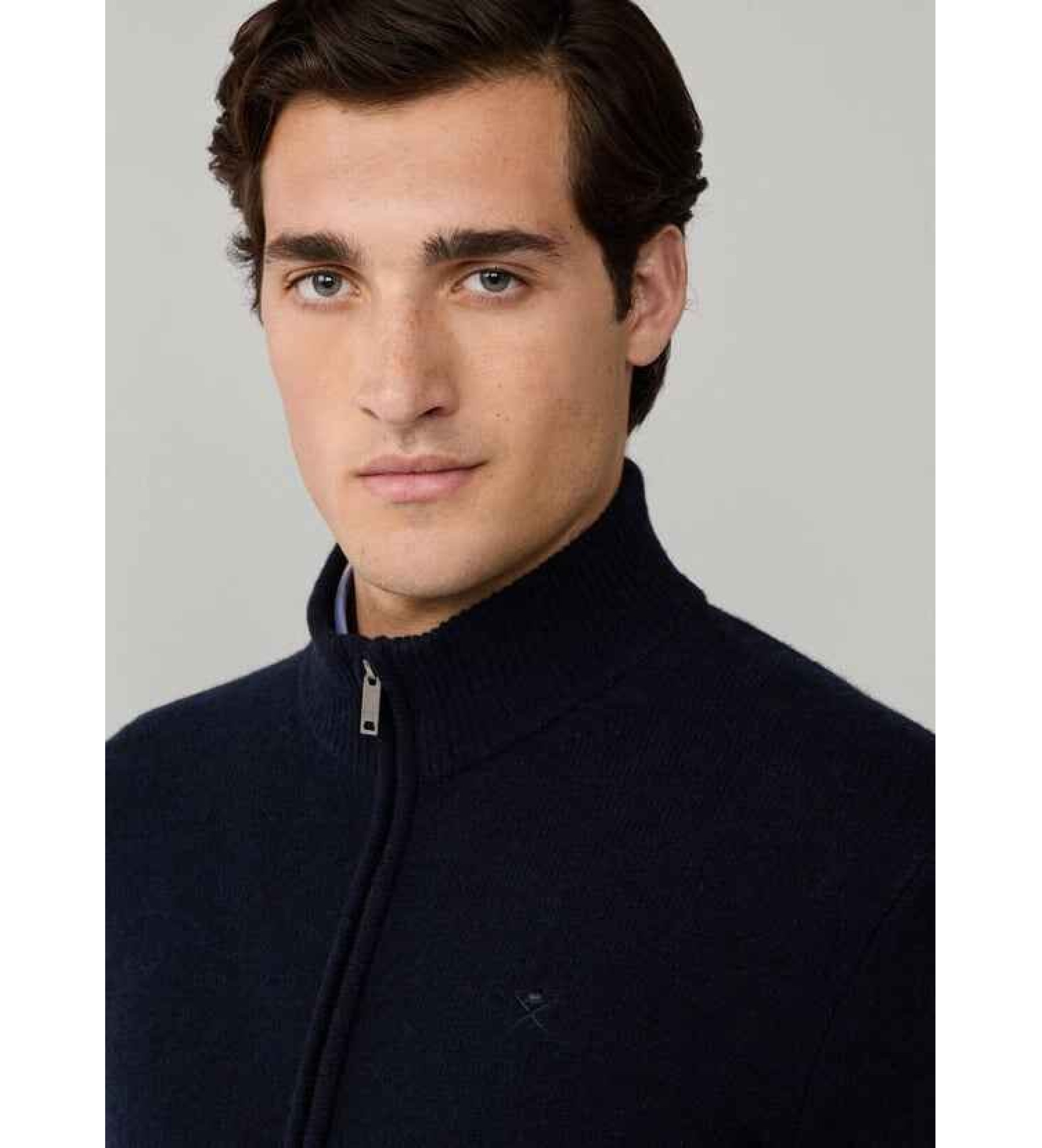 En del av Hackett Londons Essential-kollektion. Denna lammullsjacka med hel dragkedja är vävd i lyxig lammull och är helt skräddarsydd med ribbade muddar och fåll, dubbel ribbad krage, tonal broderad logotyp på bröstet och armbågslappar i mockaimitation.