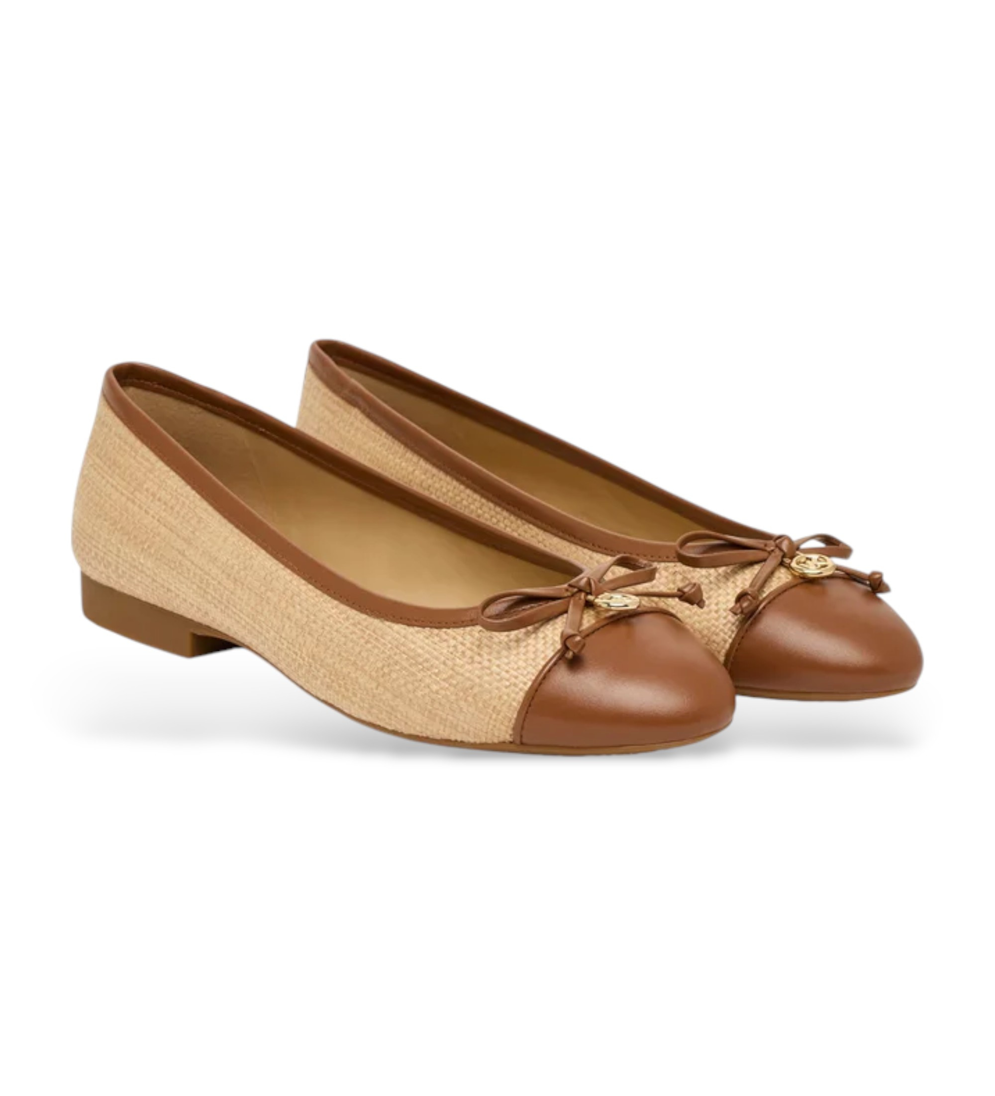 Ballerinapumps i naturlig flätad raffia med kant och tåhätta i brunt läder, en materialkombination som förenar somrig lätthet med klassisk elegans. Den gyllene rosetten på tån ger skon en romantisk och raffinerad touch som gör den till säsongens stjärnaccessoar, perfekt både till vardags och vid mer speciella tillfällen.