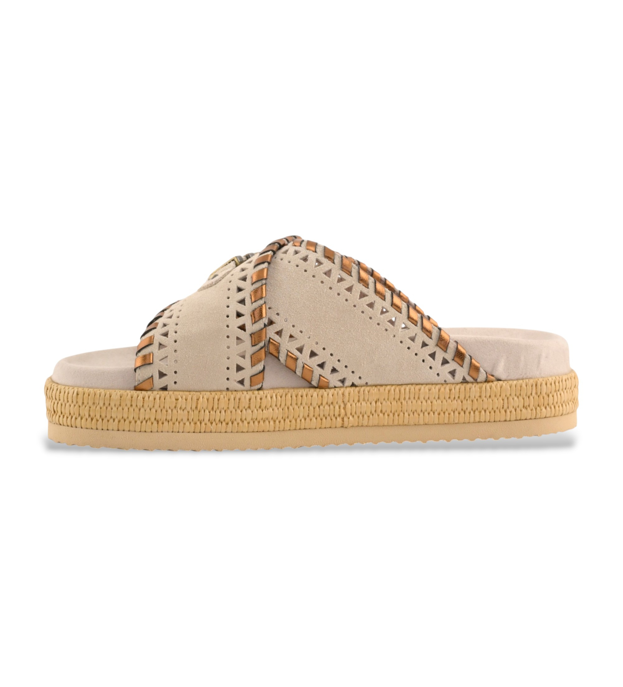 Nya för PV26-säsongen, crossover-sandaler med metallsömmar. Denna modell är tillverkad av premiummocka med en stor metalliclogotyp och har en lätt EVA-yttersula med repdetaljer och en dämpad mockafotbädd för komfort.