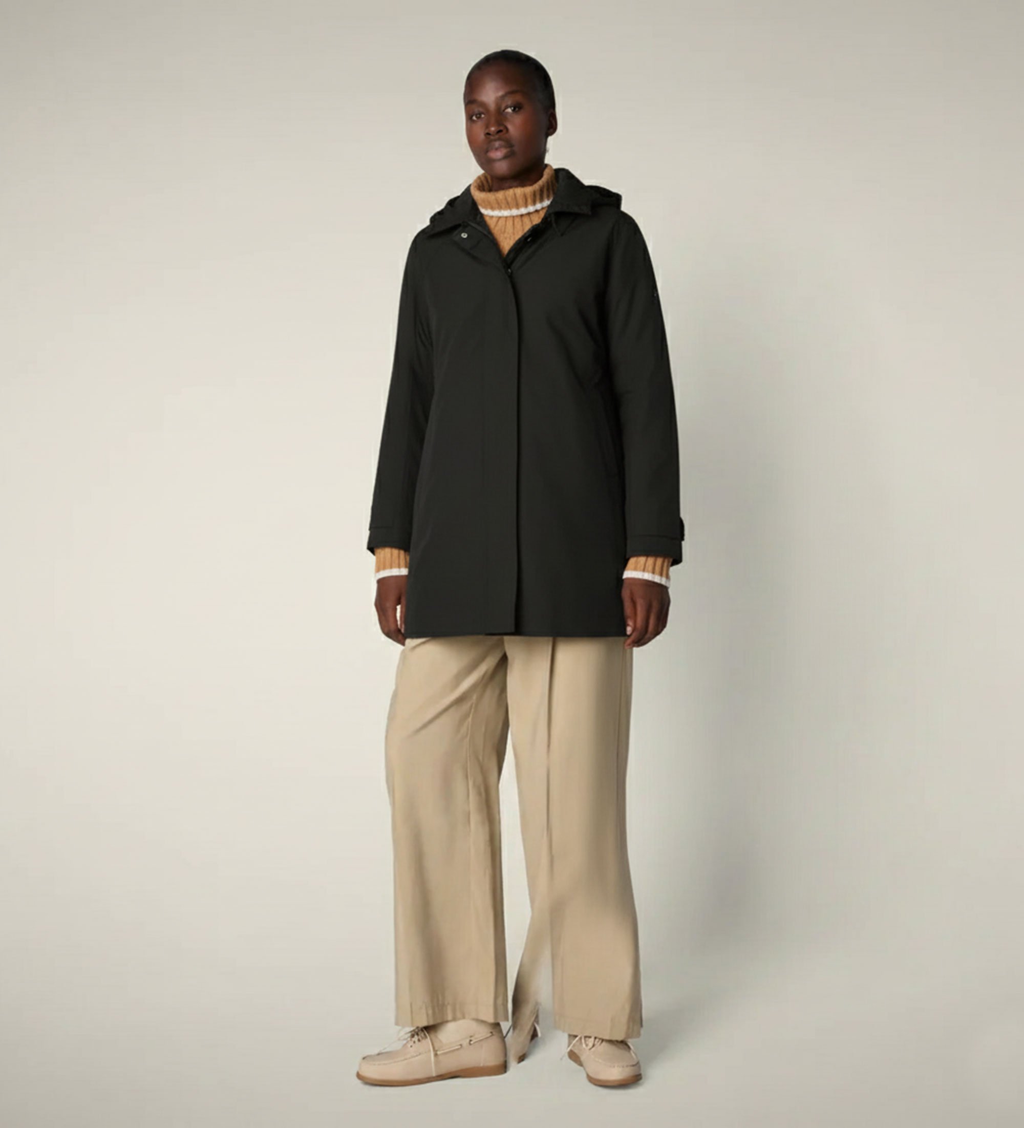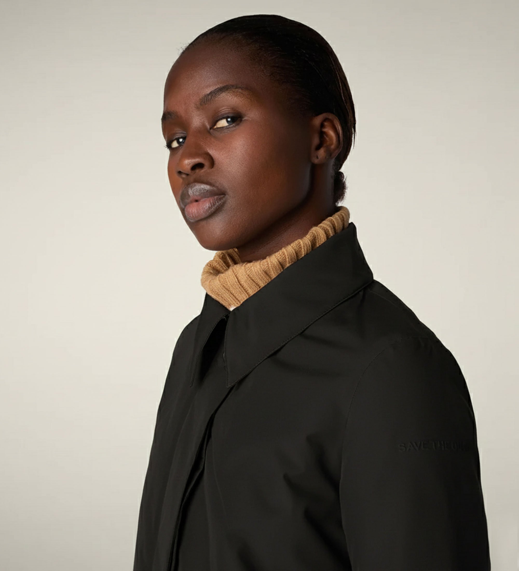 Embie är designad för regniga dagar och erbjuder skydd utan att kompromissa med stilen. Tillverkad av återvunnet vattentätt tyg med matt finish och en längd som sträcker sig till mitten av vaden, kombinerar den funktionalitet med tidlös elegans.