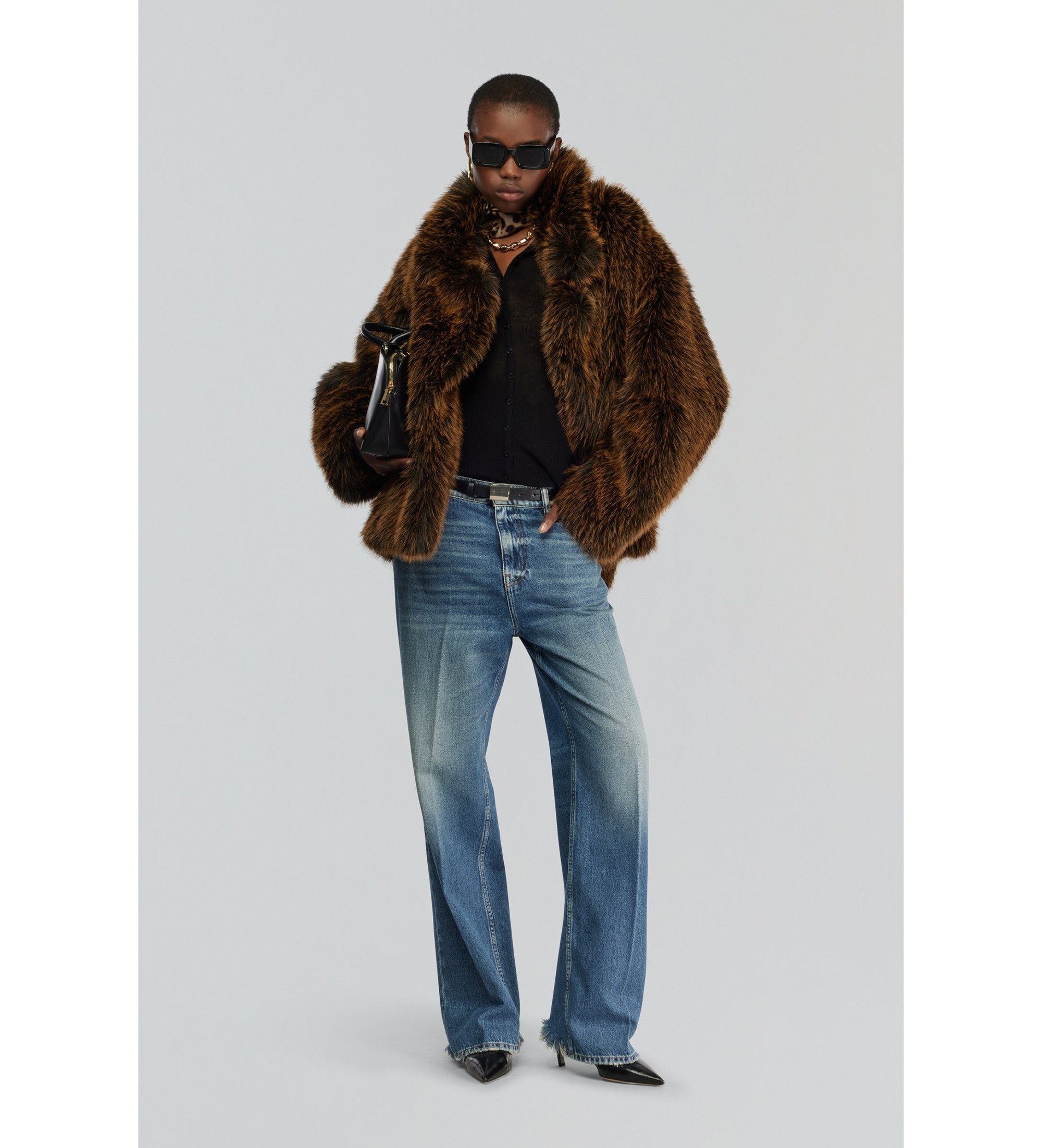 En kappa i eco-pelliccia med en elegant och modern design, perfekt för att ge en sofistikerad touch till vinterlooken. Den vida silhuetten och höftlängden gör den bekväm och lätt att kombinera.
