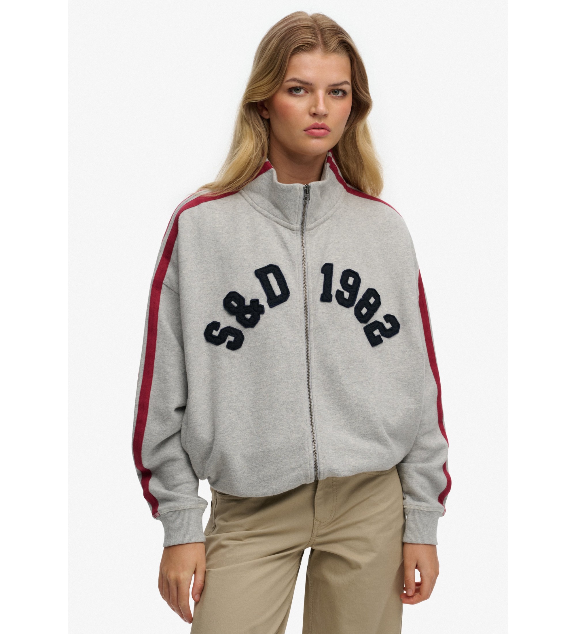 Oversized jacka designad för kvinnor som kombinerar komfort med en raffinerad sportig känsla. Den är tillverkad i 100% bomull i marmorerad grå färg och har en avslappnad, modern silhuett. Den har en central dragkedja, ribbade kanter i krage, manschetter och nederkant samt ett lätt borstat foder för en varm känsla. Kontrastränder på ärmarna och applicerad text på bröstet ger vintage-karaktär, medan den broderade plaketten på baksidan och märkesetiketten kompletterar designen. Den är praktisk och funktionell och har två ytterfickor för extra bekvämlighet.