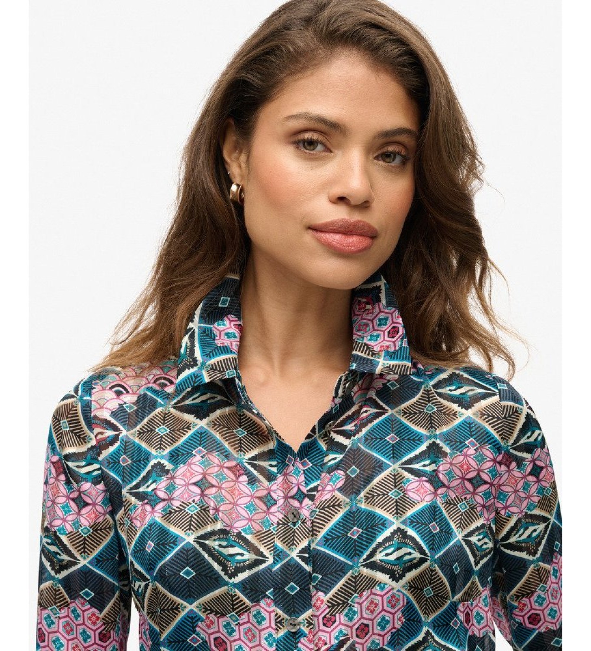 Långärmad skjorta med geometriskt och blommigt tryck i nyanser av grönt, rosa och guld. Ett livfullt plagg med mycket personlighet som kombinerar två printvärldar till ett unikt och färgstarkt resultat.