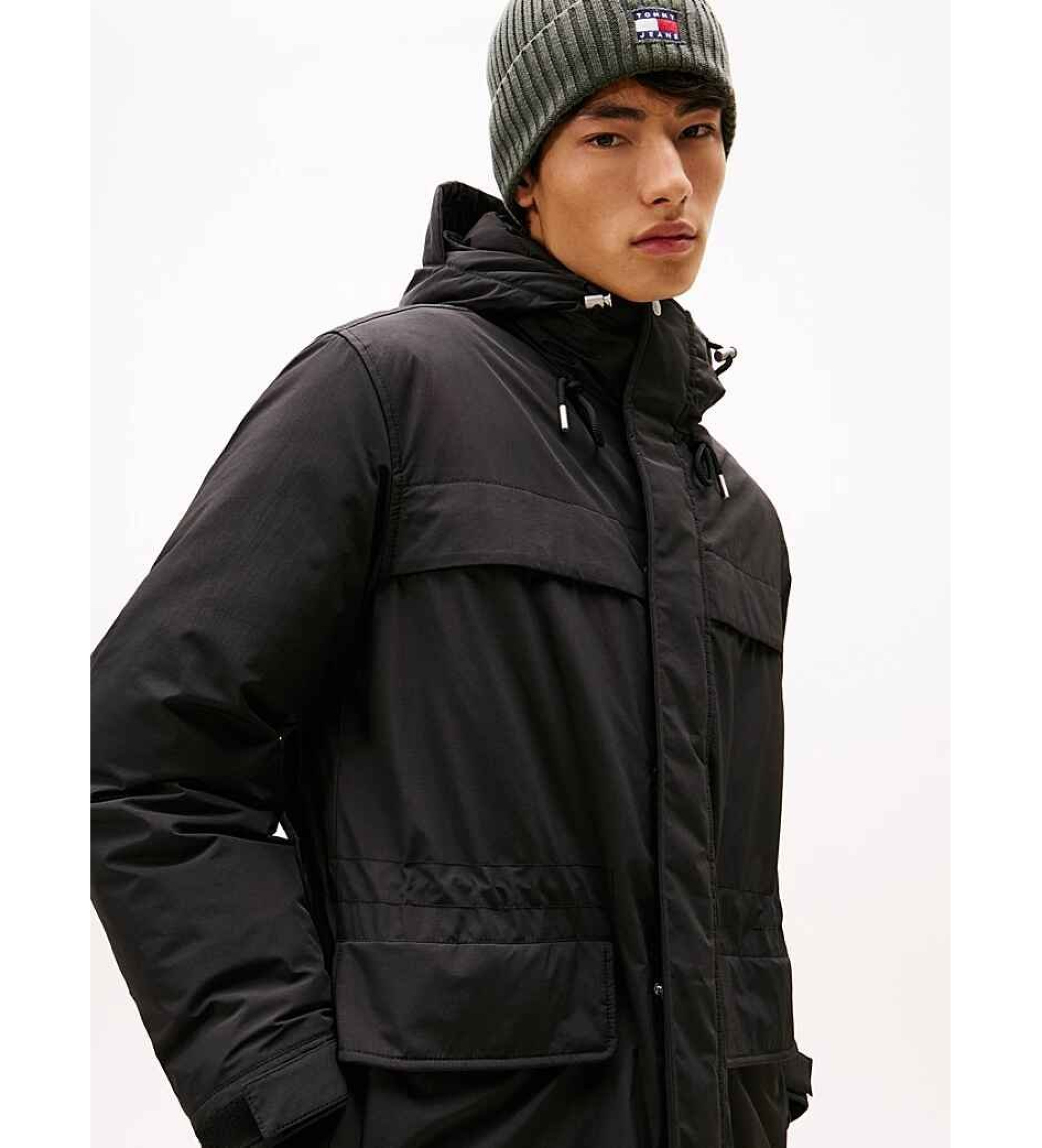 Designad för mannen som söker funktionalitet med stil, är detta den perfekta följeslagaren för regniga dagar. Den avslappnade, minimalistiska silhuetten har en fast huva med justerbar dragsko och dold frontknäppning, vilket ger ett effektivt skydd utan att kompromissa med designen. Tommy Jeans-logotypen på ärmen adderar Tommy Jeans-varumärke. Denna parkas är tillverkad av 100% återvunnen nylon och representerar ett ansvarsfullt val utan att kompromissa med sofistikerad design.