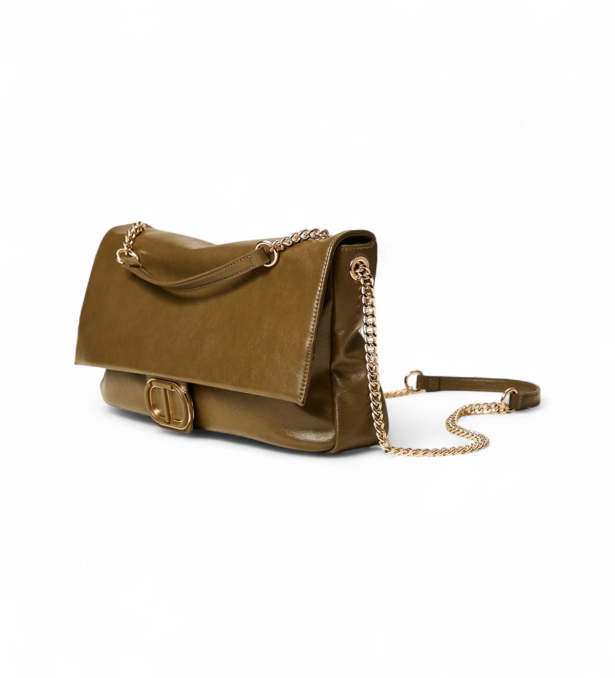 Mjuk, halvblank axelremsväska i kalvskinn med en naturlig, vågig yta. Klaffstängning med magnet, matchande målad Oval T-logotyp i hartseffekt med metallbas och axelrem i kedja med förstärkning. Fodrad och med innerfickor.