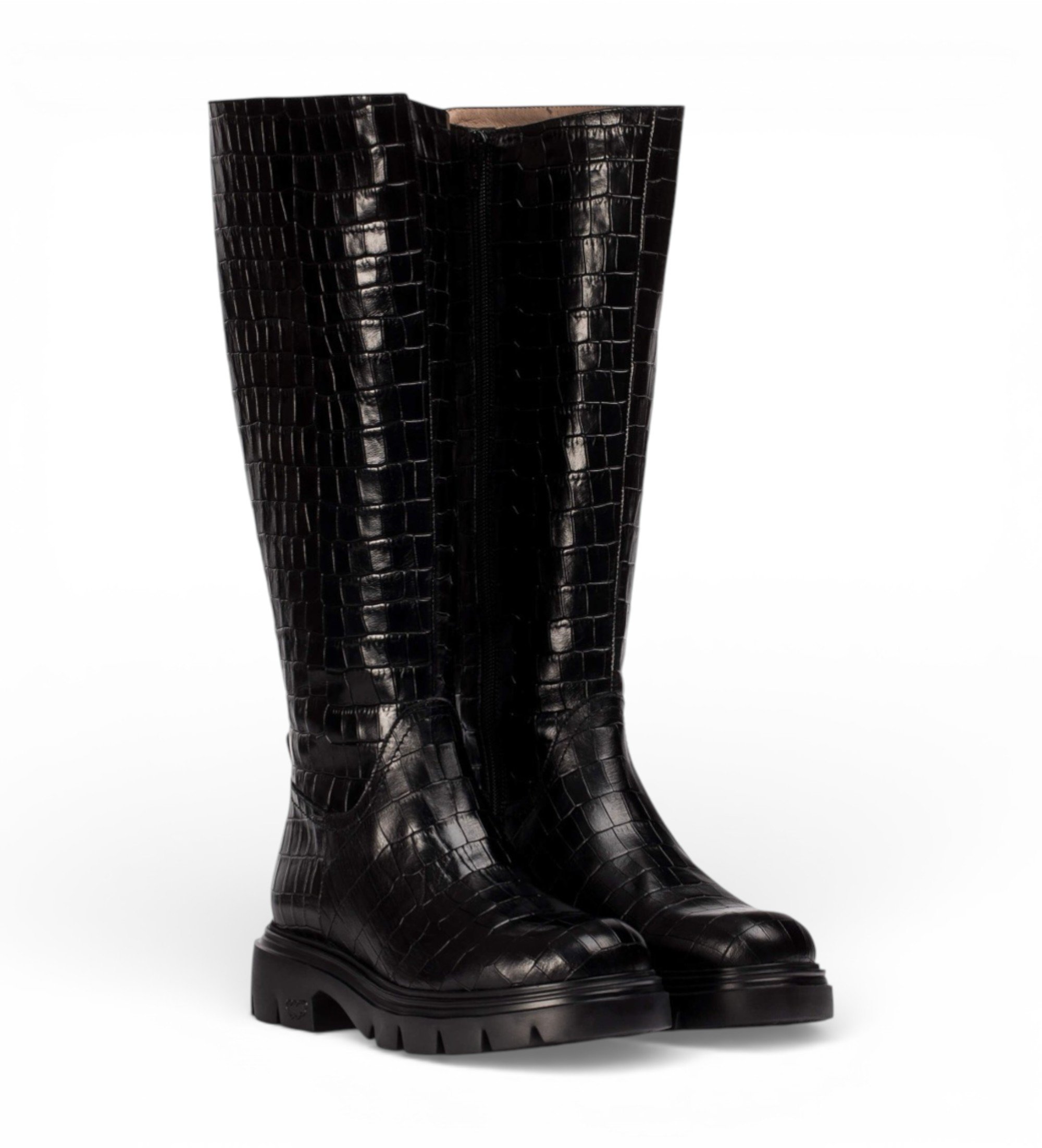 BONES 04 stövlar i svart kokosnötspräglat läder. Denna modell utmärker sig för sin eleganta finish i krokodilpräglat läder som ger designen textur och sofistikerad känsla. Det strukturerade skaftet anpassar sig bekvämt efter benet och den invändiga dragkedjan gör den lätt att ta på. FlyGrip-tekniken på sulan garanterar extraordinär lätthet och komfort samt överlägsen absorption och grepp. Den inre MemoryGel-innersulan anpassar sig perfekt till foten och ger komfort i varje steg. Gör dig redo att känna #YesWeFly-känslan. Wonders arbetar för en ansvarsfull tillverkning som stöds av LEATHERWORKINGGROUP.
